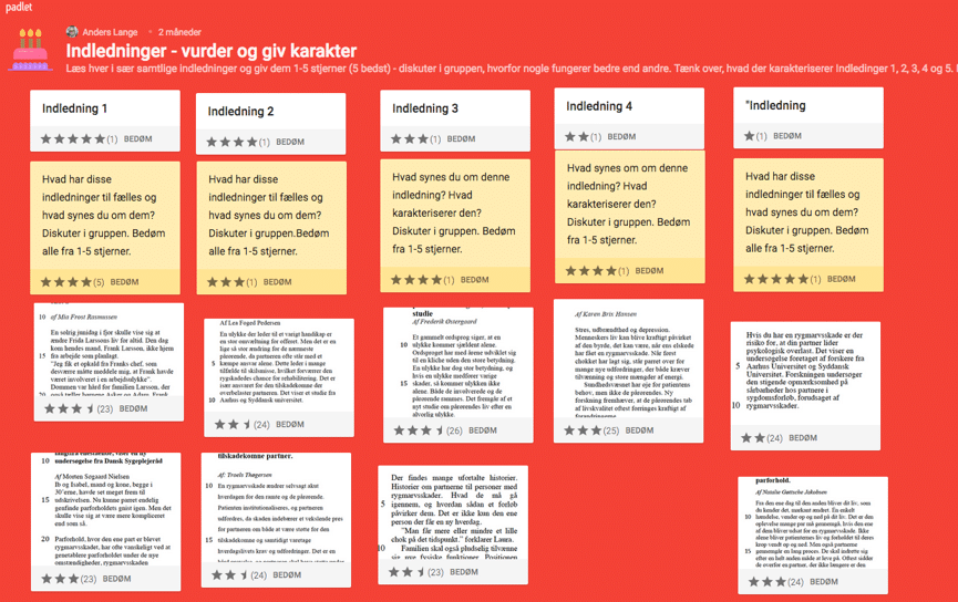 FORBEREDELSE: Jeg oprettede en padlet i hylder (Shelf), gav de studerende ret til at rate fra 1-5 stjerner. Jeg tog derpå screendumps af samtlige  studerendes indledninger på en skriveøvelse baseret på en videnskabelig artikel fra bladet Sygeplejersken. Derefter inddelte jeg indledningerne efter, hvilket type anslag, de havde brugt, men UDEN at de studerende blev informeret om, hvad mine inddeling var baseret på..